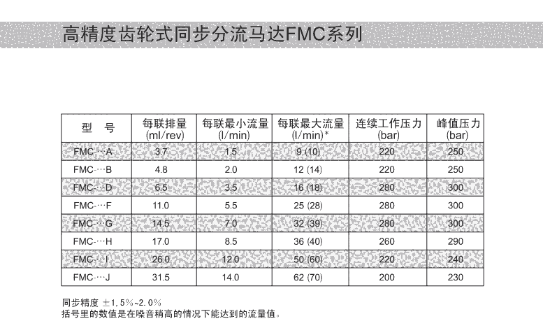 JEONFF同步馬達(dá),F(xiàn)MC系列同步馬達(dá)屬于輕型鋁合金齒輪式同步馬達(dá),具有體積小,流量范圍大、可承受工作壓力高的特點(diǎn),可組合多達(dá)12流同步控制。JEONFF鋁合金同步馬達(dá)不同排量馬達(dá)的單流流量范圍在1.5-70 L/min; 工作壓力可達(dá)300 bar,其同步精度在±1.5%-±2.5%之間,具有同步精度高、可靠性高、同步控制成本低的優(yōu)勢。